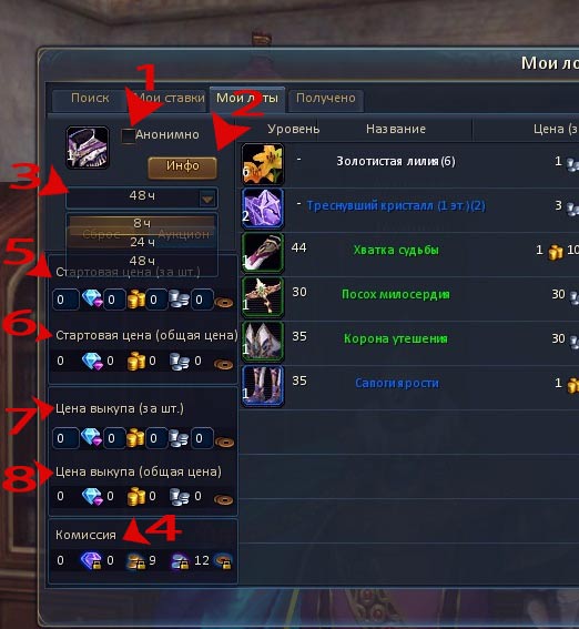 4. Комиссия - это налог на использование аукциона, комиссия берется в нумиях и зависит от вида и качества итема, а так же времени которое вы установите.