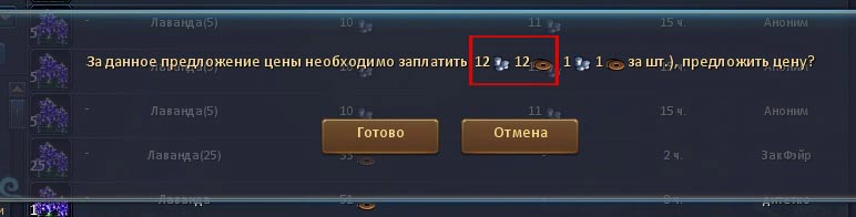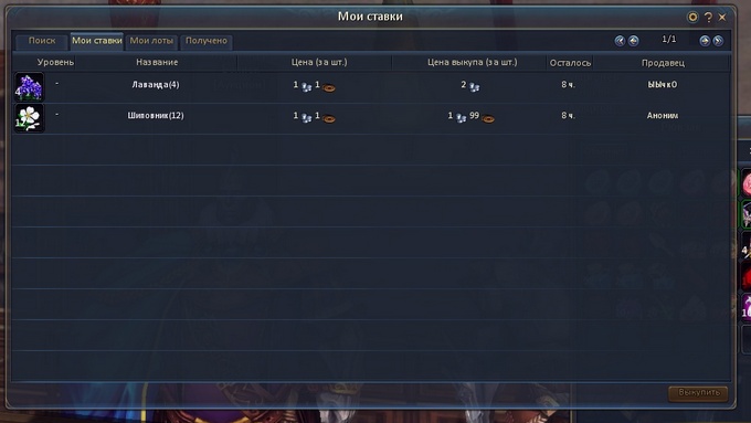 Если разница между начальной ставкой и выкупом велика или у вас на выкуп не хватает денег, можно сделать ставку, что бы сделать ставку вам придется заплатить сумму из столбца "Цена(за шт.)" +10%, то есть если начальная цена цена лота 10 золота, что бы сделать ставку вам нужно отдать 10 золота и 10 серебра. Ставка может быть "перебита" другим игроком, в этом случае вашу ставку вам вернут.